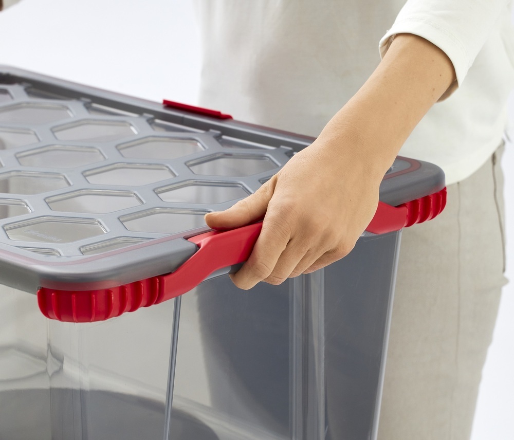 Spremnik od 65 litara s poklopcem, gumenim brtvljenjem i amortizatorima za zaštitu. Dimenzije 59 x 39,5 x 41,2 cm, težina 1,85 kg. Dostupan u boji transparentna antracit/crvena.