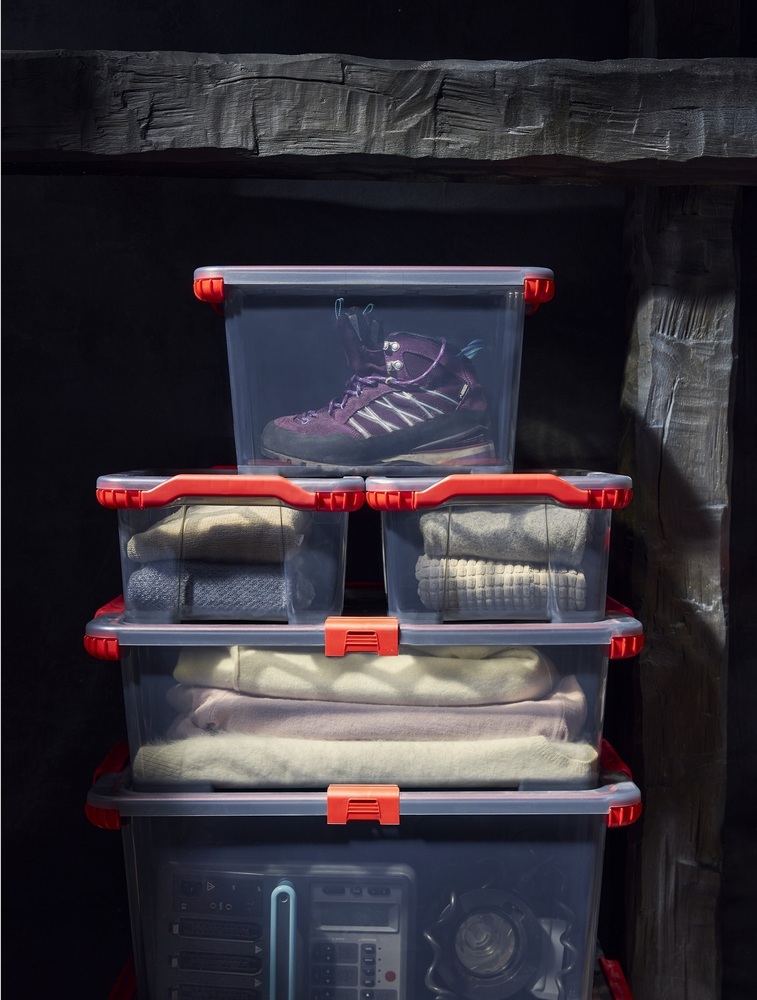 Plastični spremnik od 65 litara s poklopcem i gumenim brtvljenjem štiti sadržaj od vlage, štetočina i prašine. Amortizirani poklopac osigurava stabilnost i otpornost na pukotine, dok praktične kopče omogućavaju sigurno zatvaranje. Dizajniran od strane švicarske marke Rotho, ovaj spremnik spaja funkcionalnost s pouzdanom izradom.